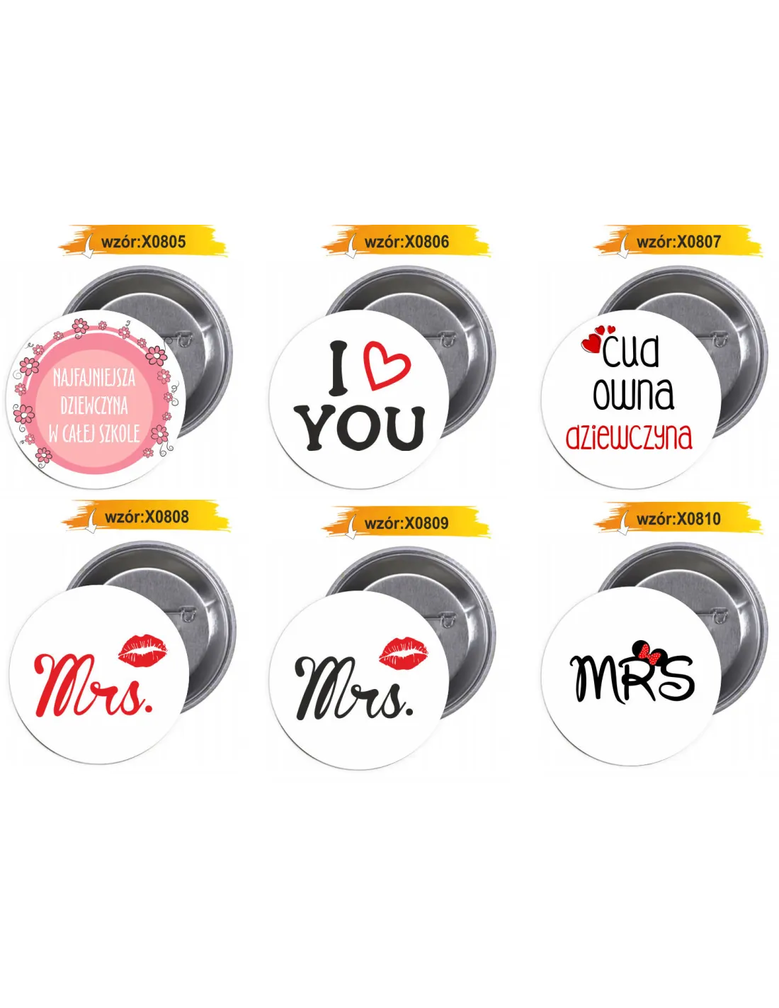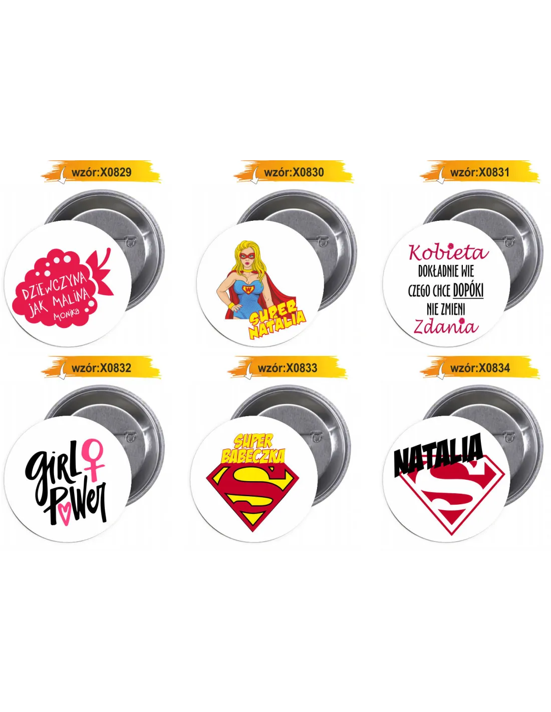 Dostępne gotowe wzory przypinek i buttonów: