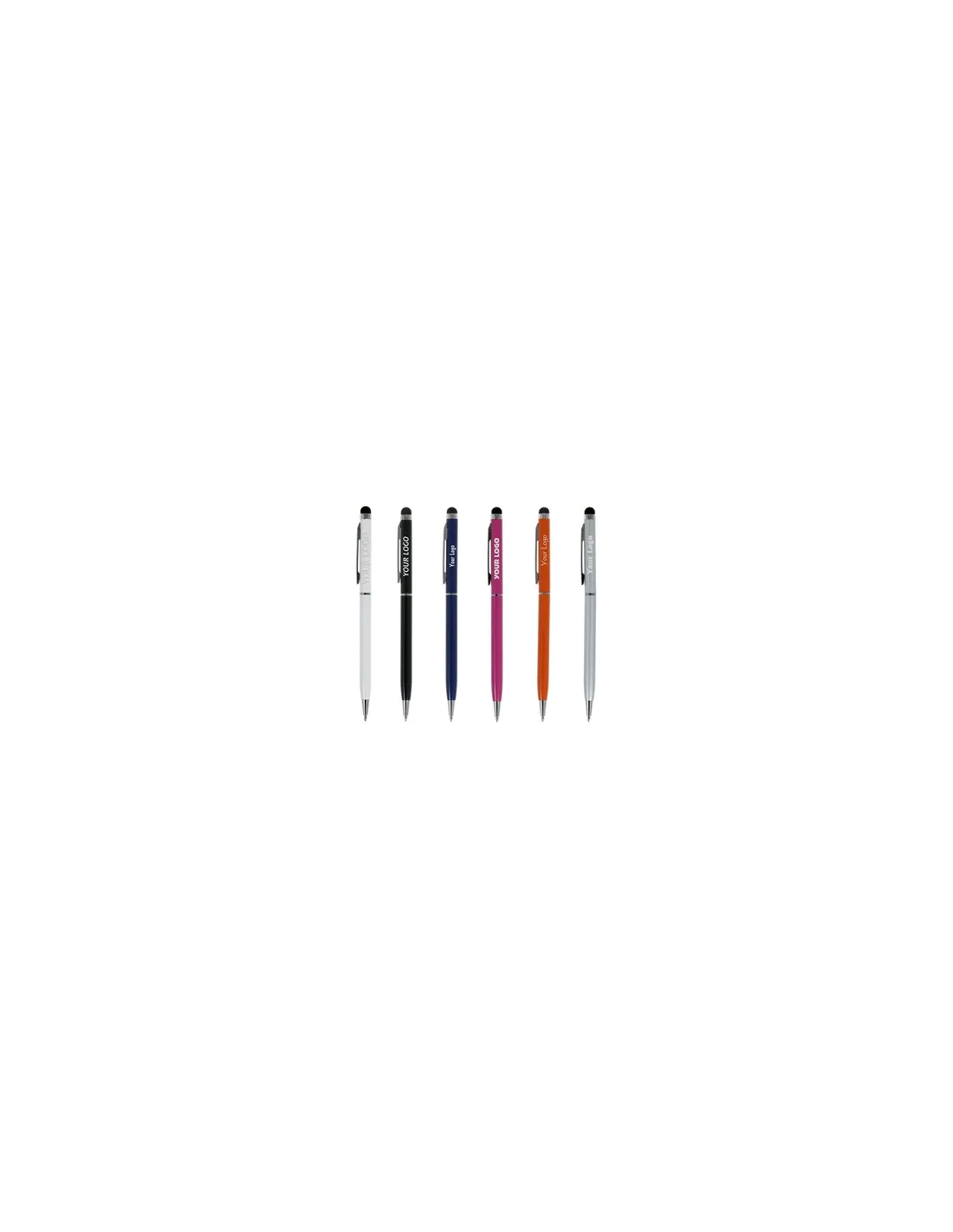 • Długopis, touch pen z kolorowym korpusem i srebrnymi elementami w 6 kolorach : biały, srebrny, czarny, różowy, pomarańczowy, granatowy.