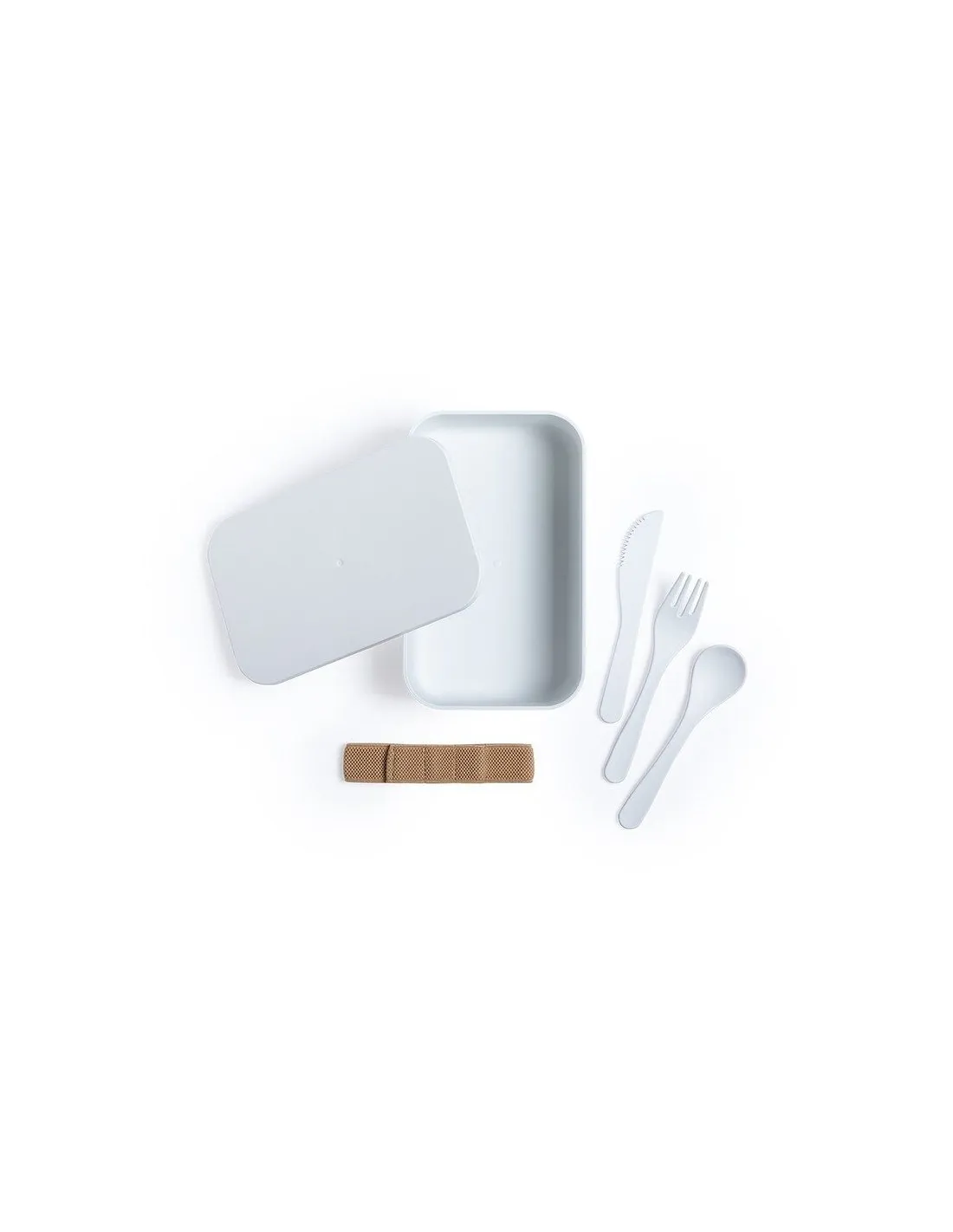 • Pudełko śniadaniowe 1 L z wieczkiem, wykonane z w 100% kompostowalnego PLA, w komplecie łyżka, nóż i widelec, połączone elastycznym paskiem, nie zawiera BPA