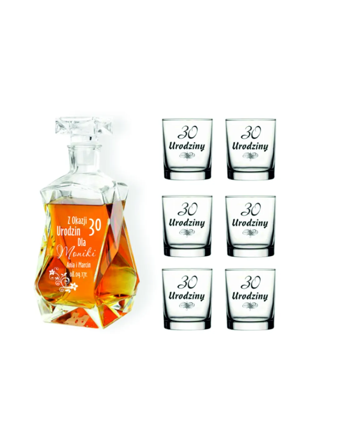 Przedmiotem aukcji jest elegancki zestaw karafka + 6 szklanek z grawerem.