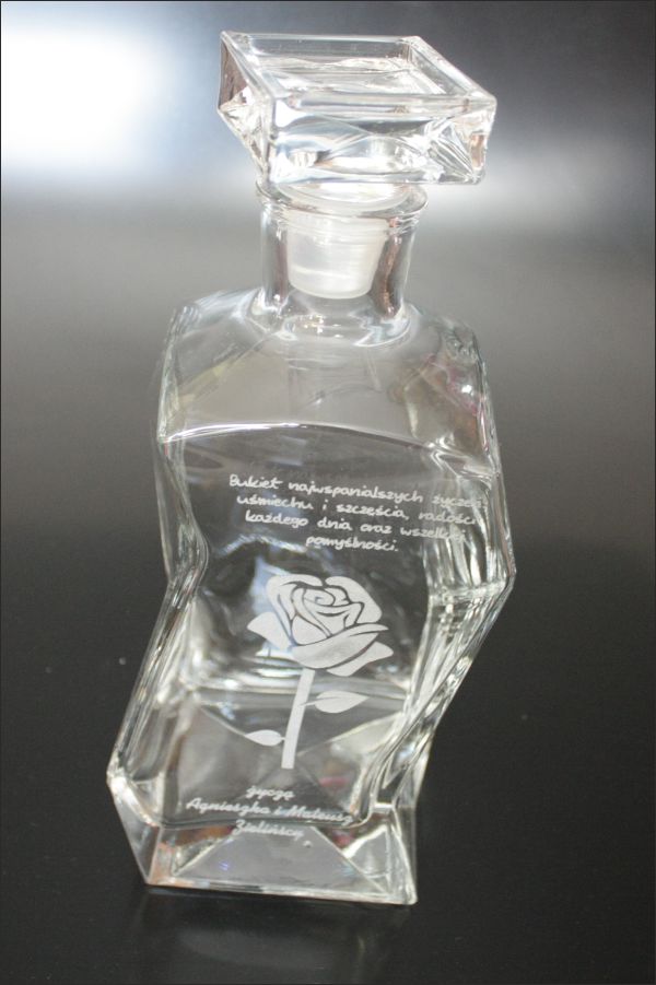 Przedmiotem aukcji jest elegancka karafka szklana z grawerem.