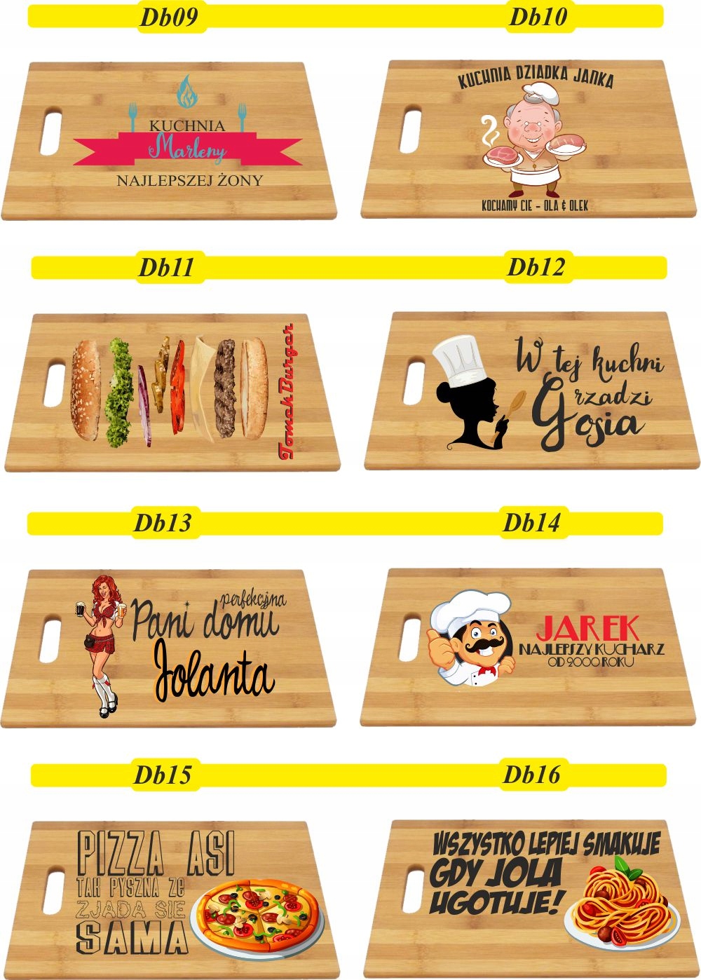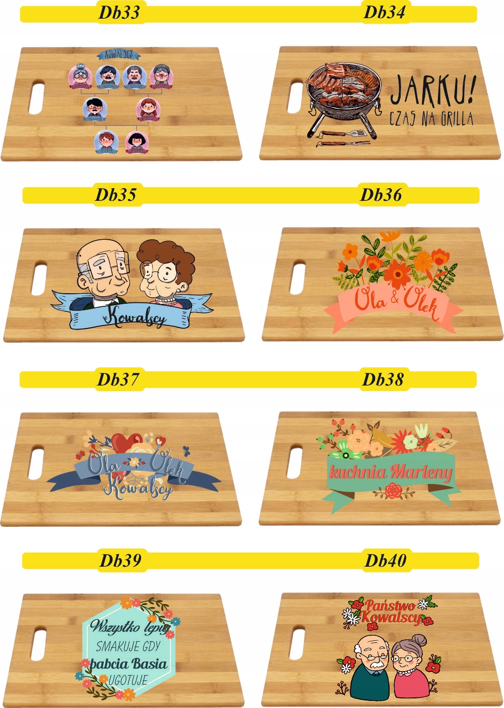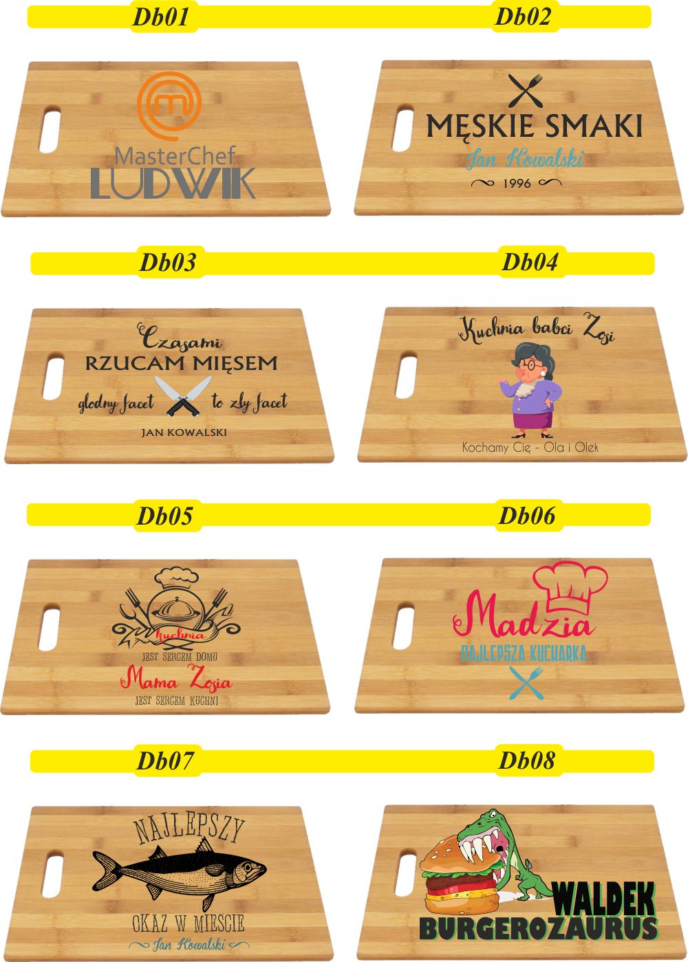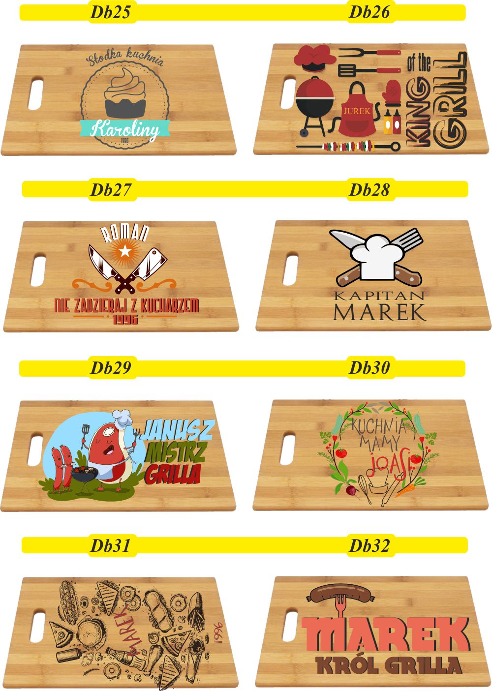 Na desce można umieścić własny projekt wysłany przez klienta, który należy dostarczyć w Corel Draw. Po zakupie należy przesłać numer wzoru, który zostanie umieszczony na desce oraz dane do wpisania np. imion lub nazwy okazji.
