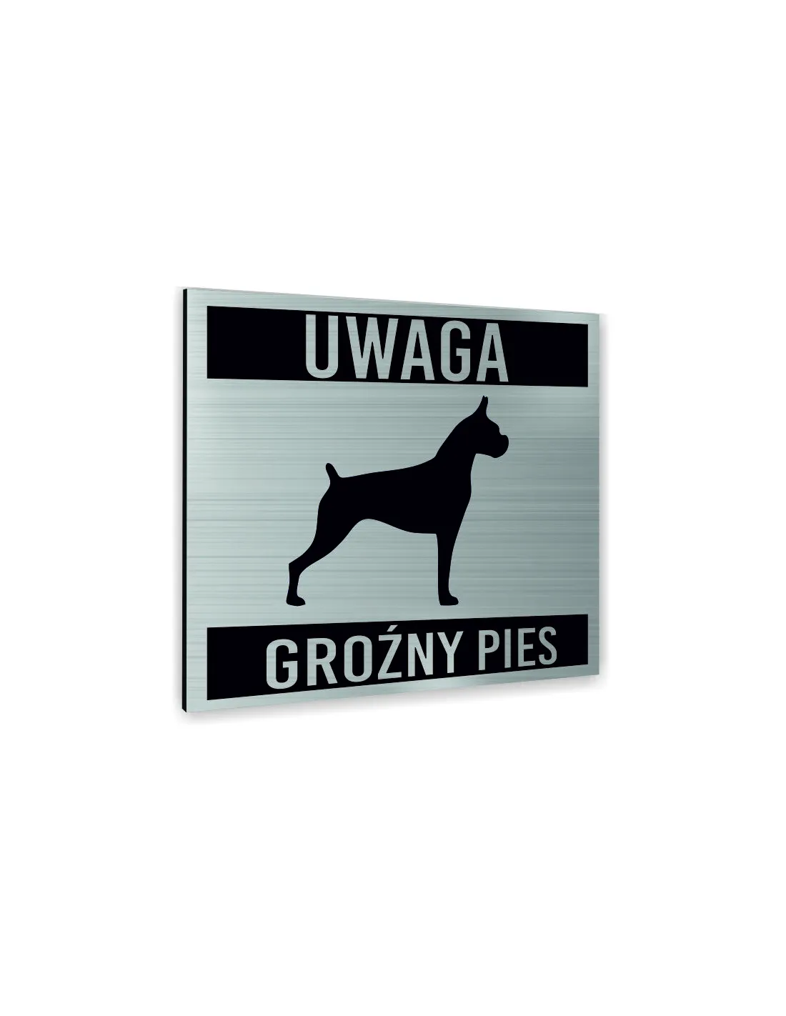 Tabliczka SREBRNA UWAGA GROŹNY PIES TEKST DOWOLNY TEKST NAPIS Tablica nierdzewna PIKTOGRAM ALUMINIUM