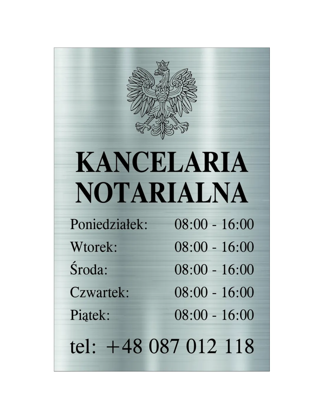 Tabliczka Grawerowana Kancelaria Notarialna godziny otwarcia srebrna 30x20 cm