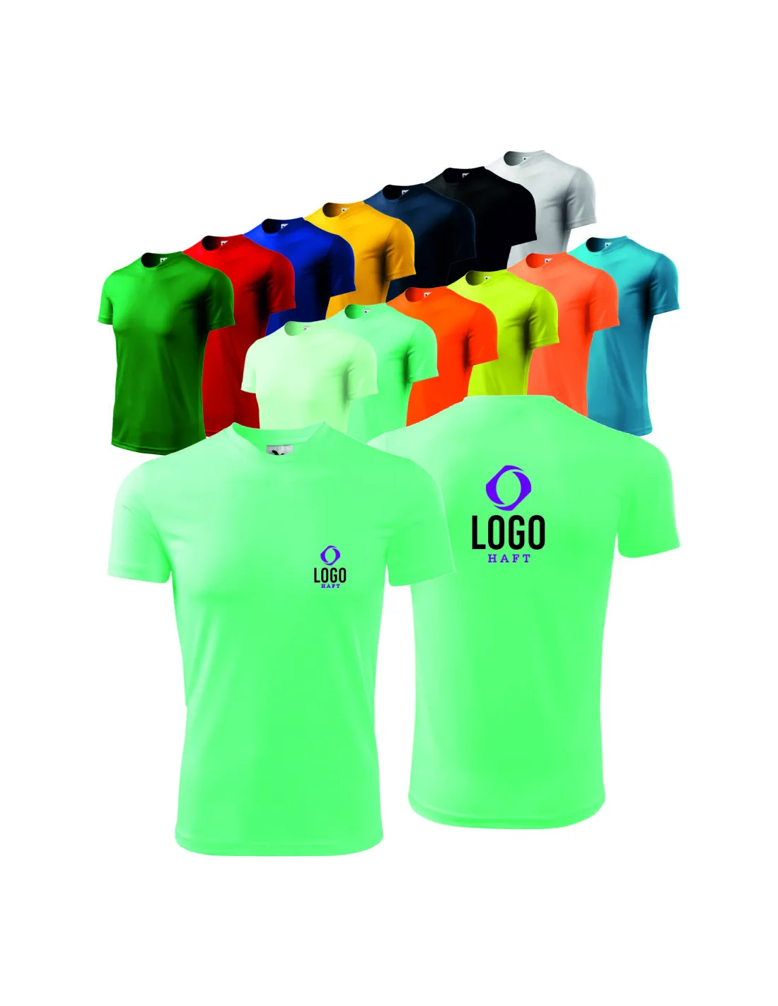 Dostępne kolory koszulek : biały,  czarny, chabrowy, żółty, fioletowy czerwony, zielony, błękitny, pomarańczowy, limonkowy, koralowy, miętowy