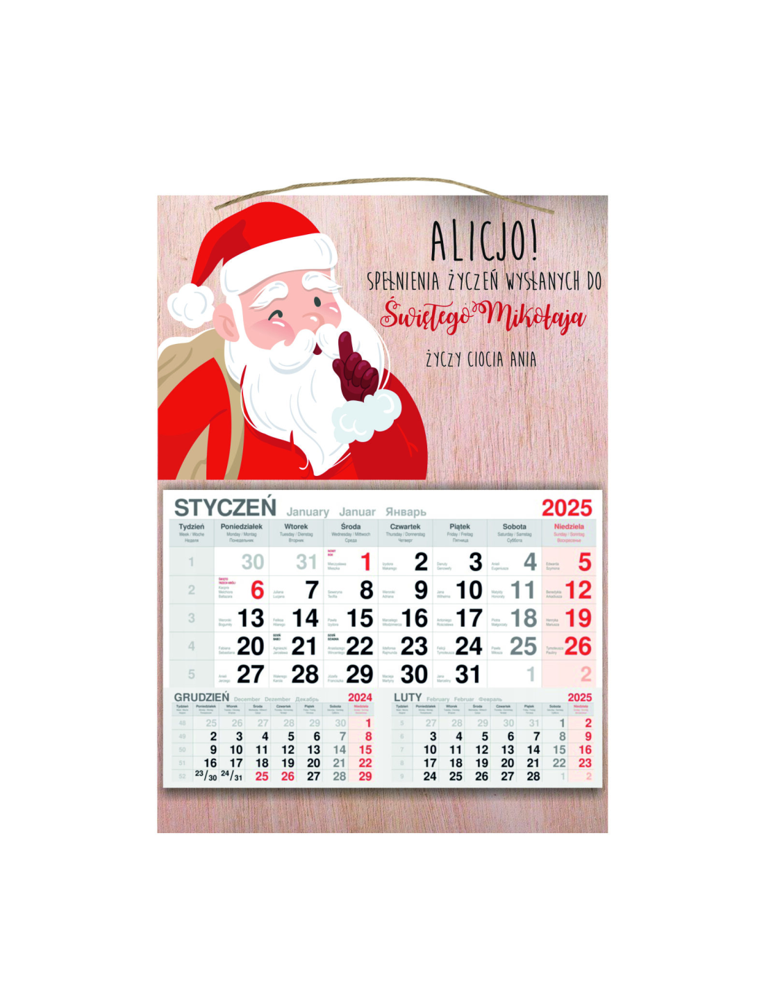 KALENDARZ wiszący 2025 jednodzielny DREWNIANY prezent na ŚWIĘTA MIKOŁAJKI