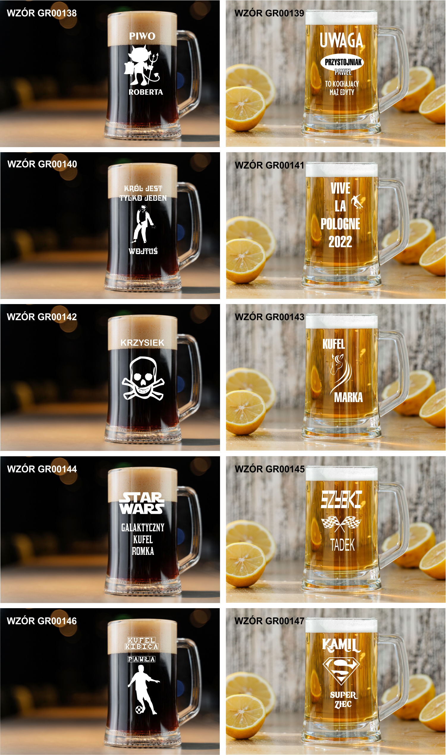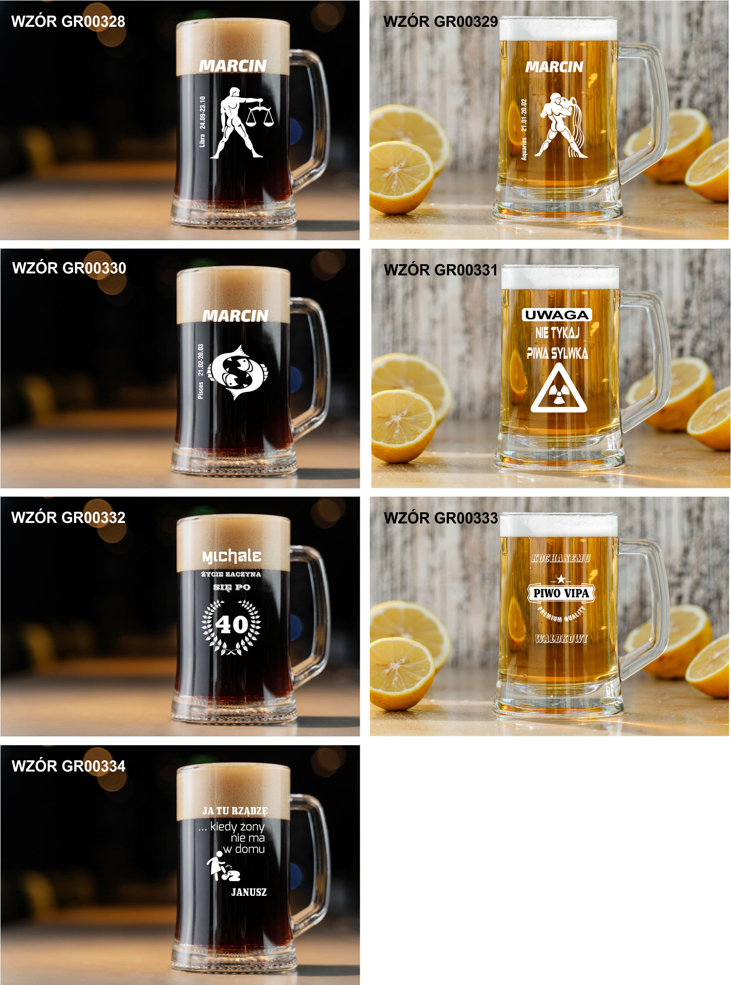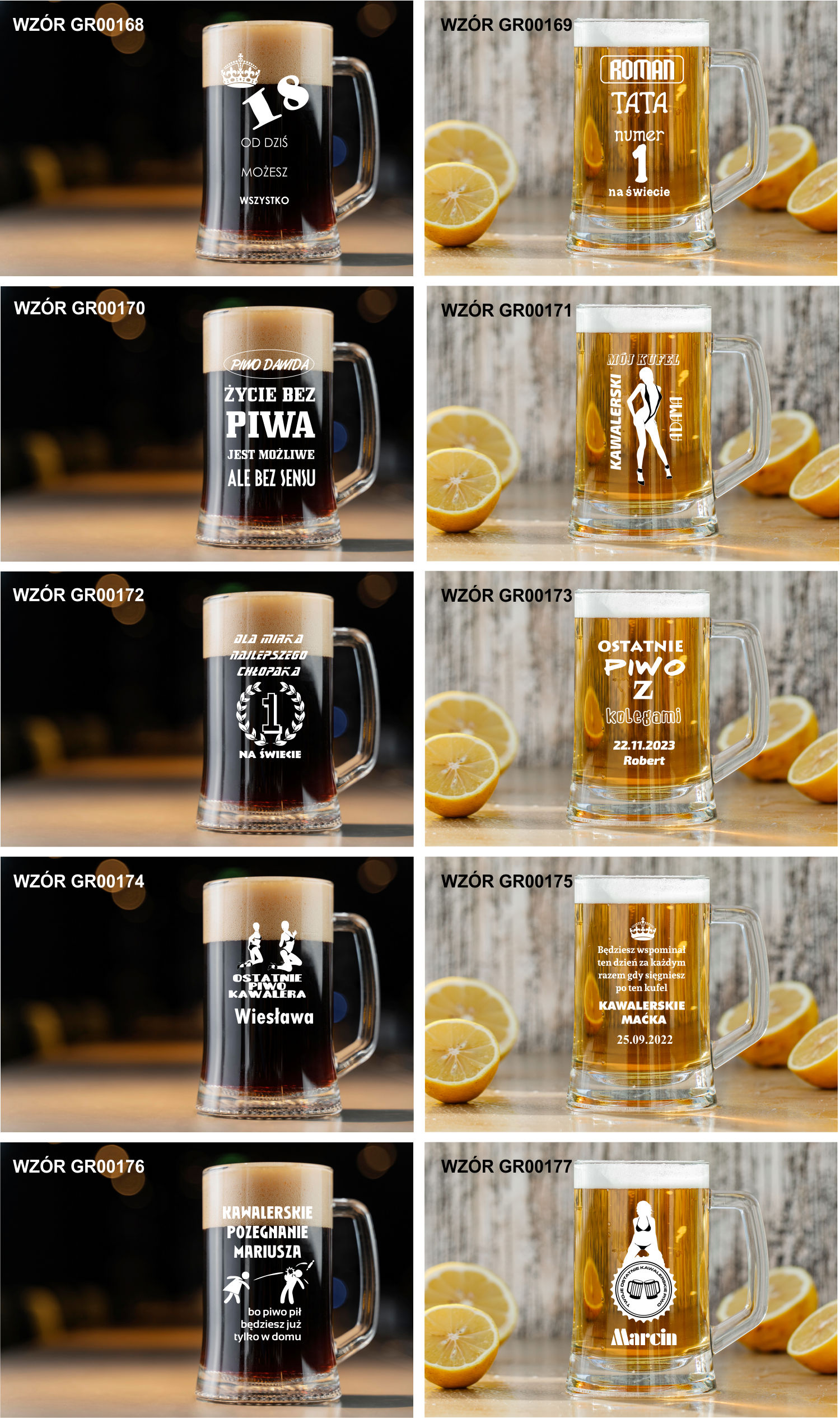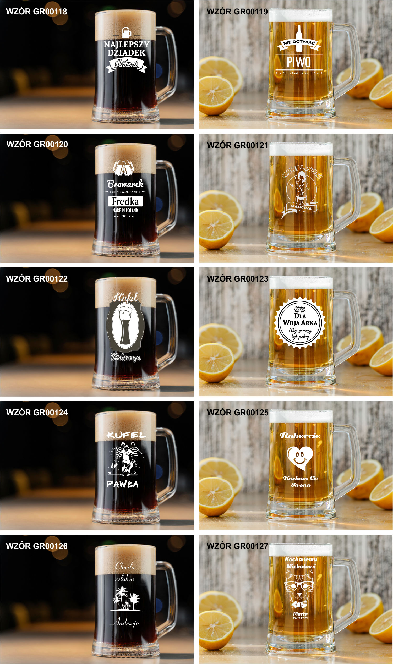 Przykładowe wzory kufli z grawerem: