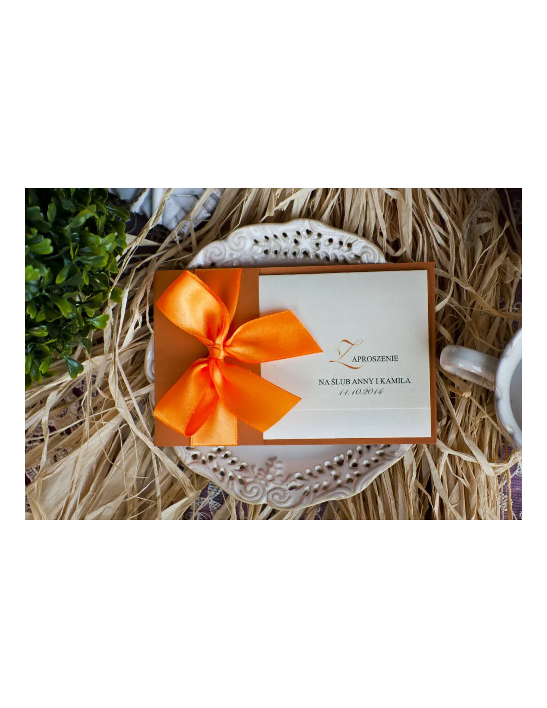 ZAPROSZENIA ślubne Perłowe Glamour z pomarańczową wstążką kokardą