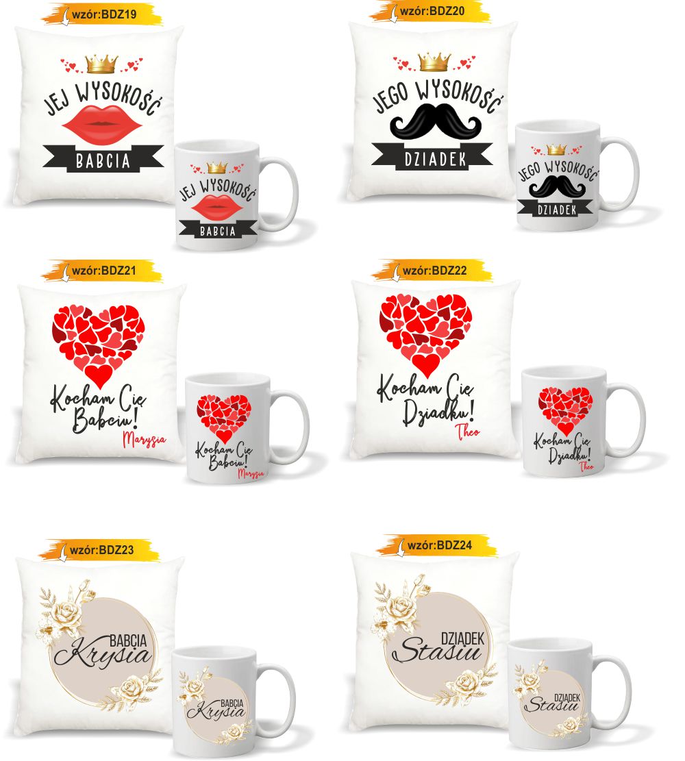 Przykładowe wzory zestawów Foto Poduszka + Foto Kubek z nadrukiem: