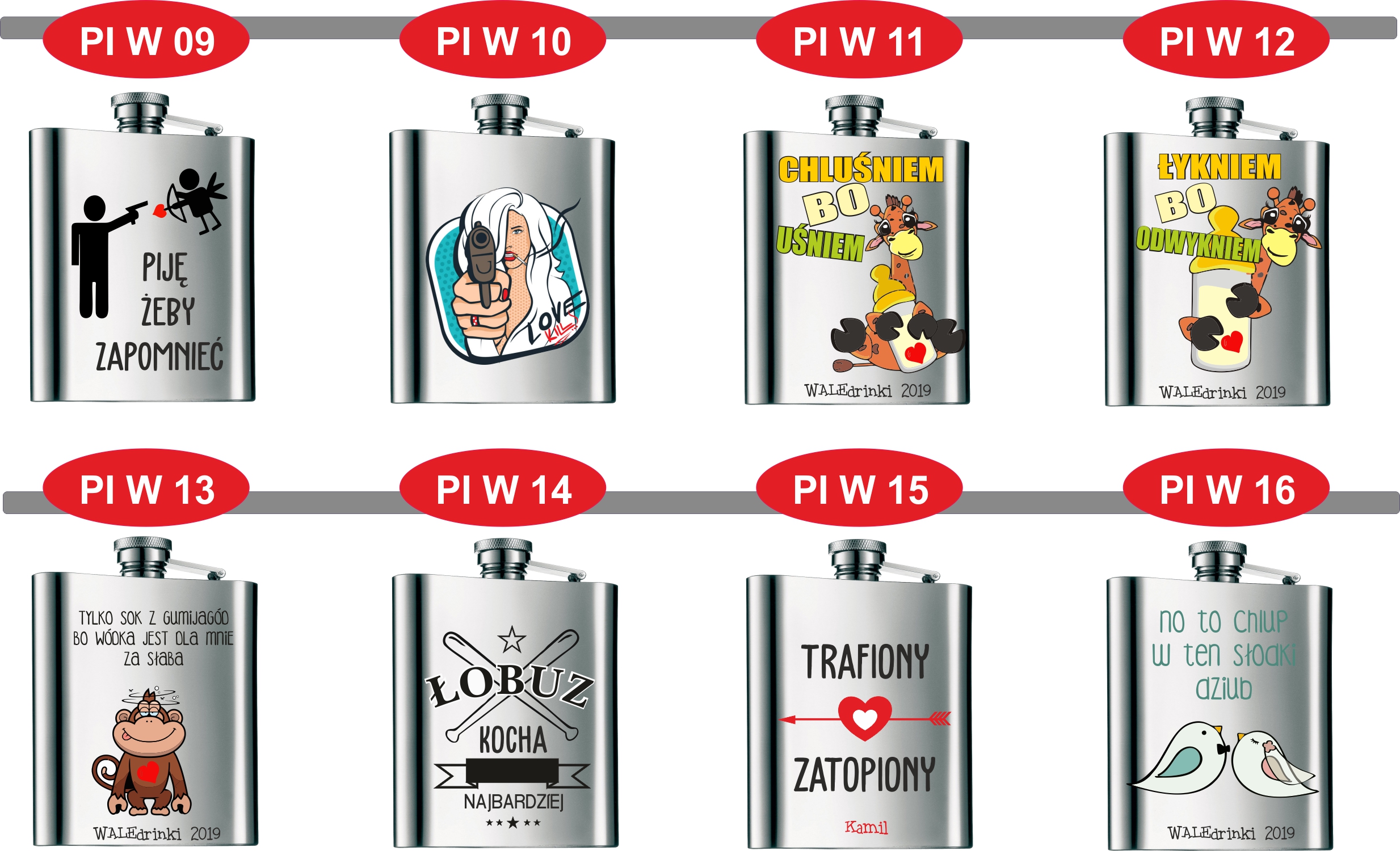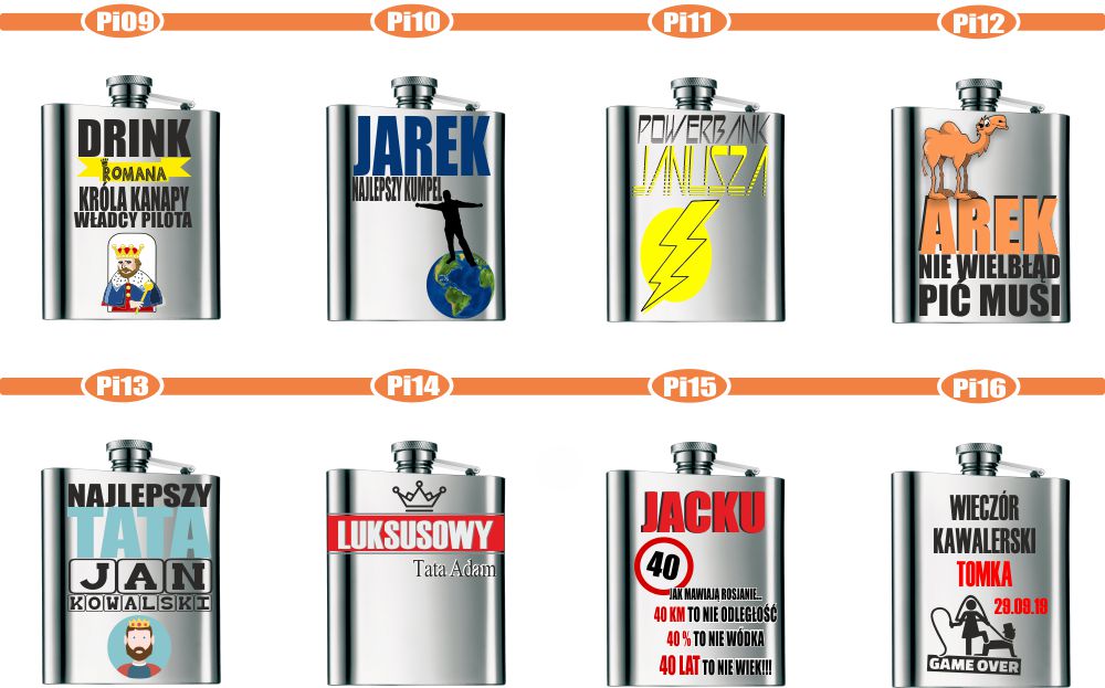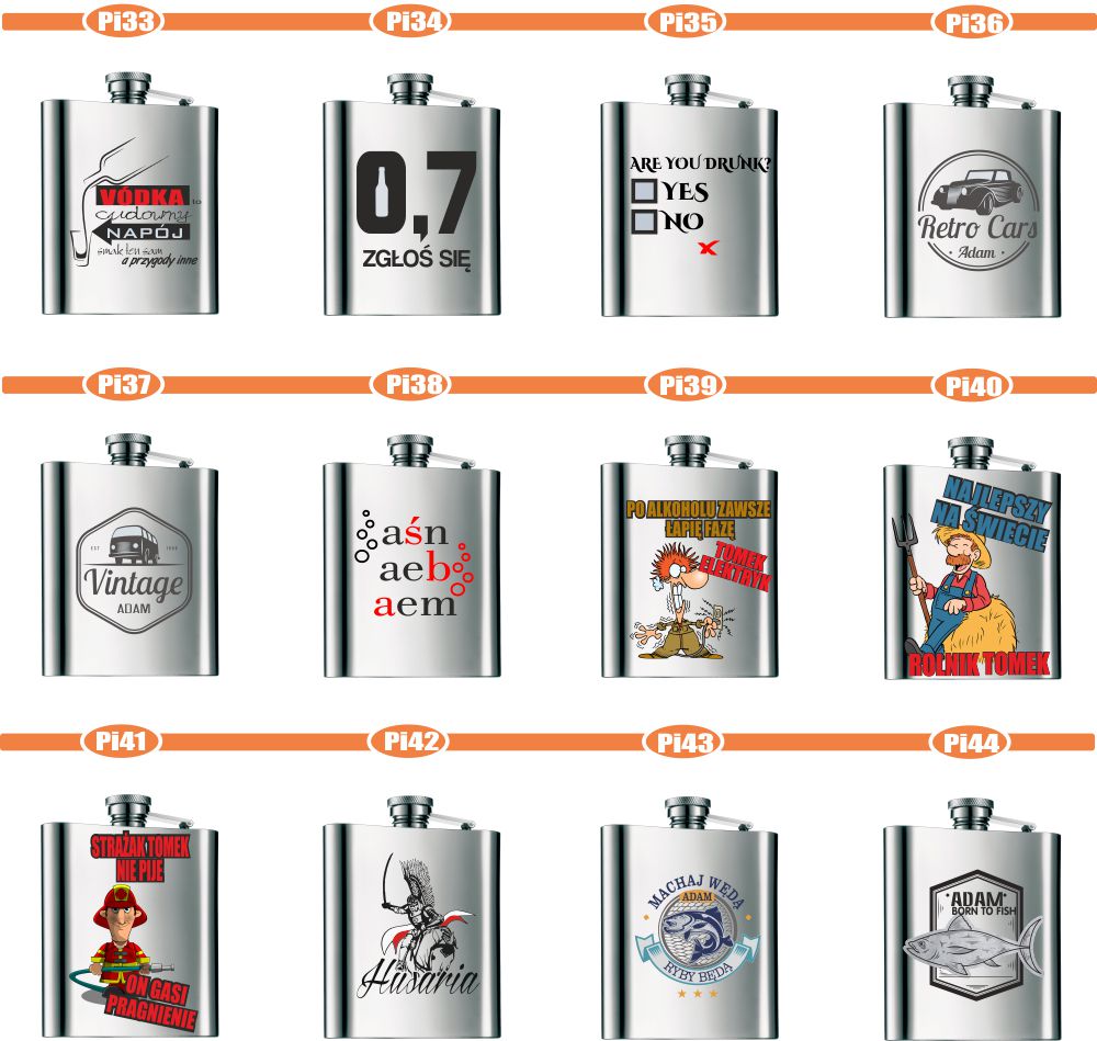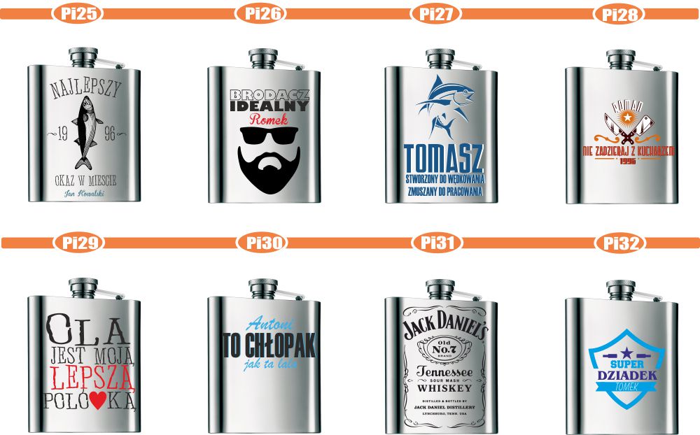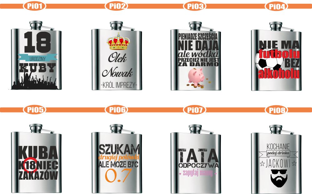 Przykładowe wzory nadruków na piersiówkach :