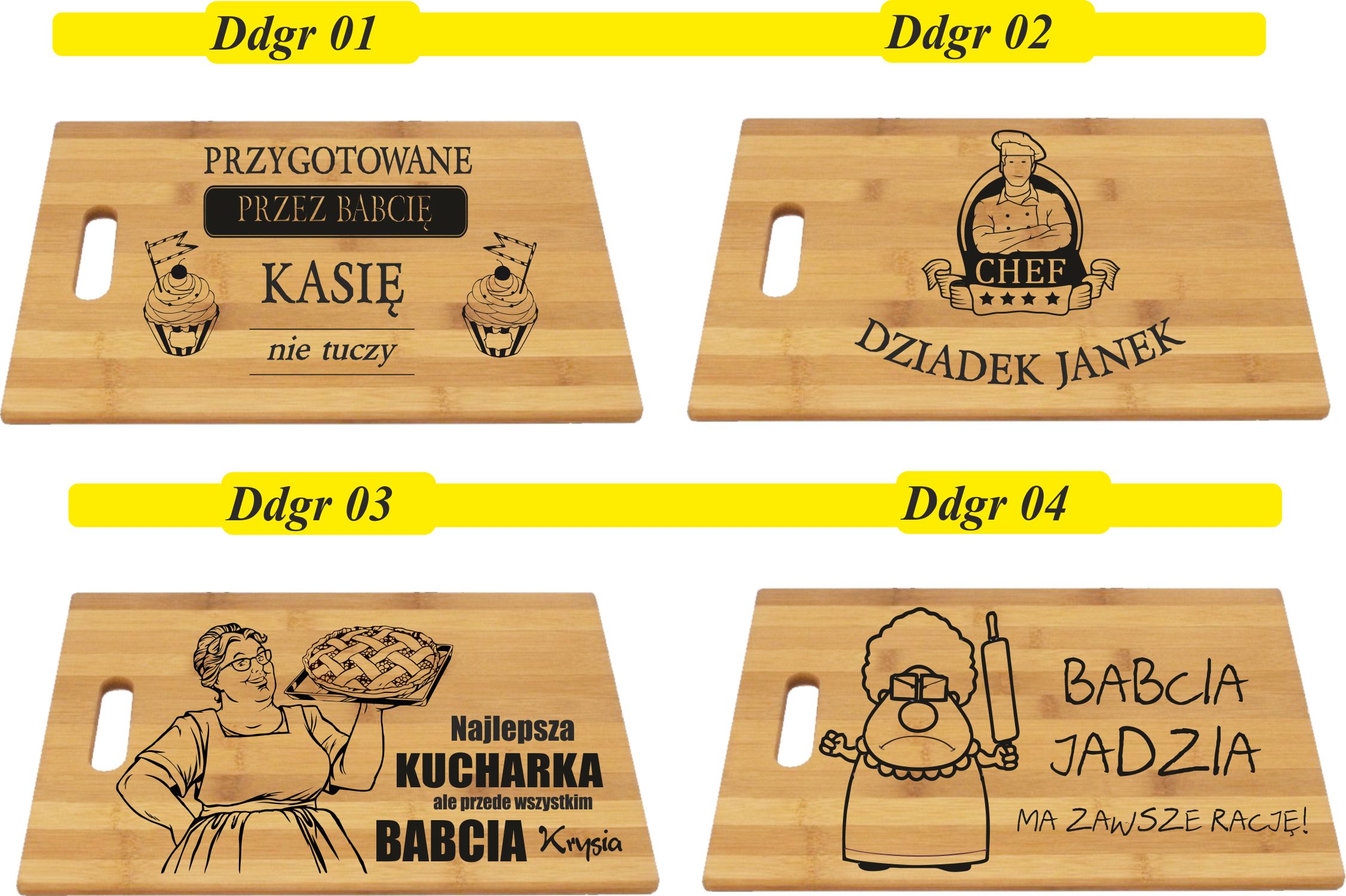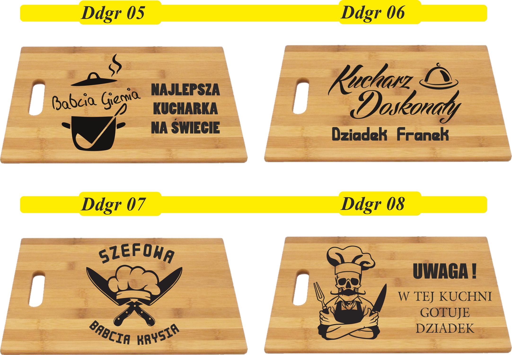 Przykładowe wzory desek bambusowych z grawerem: