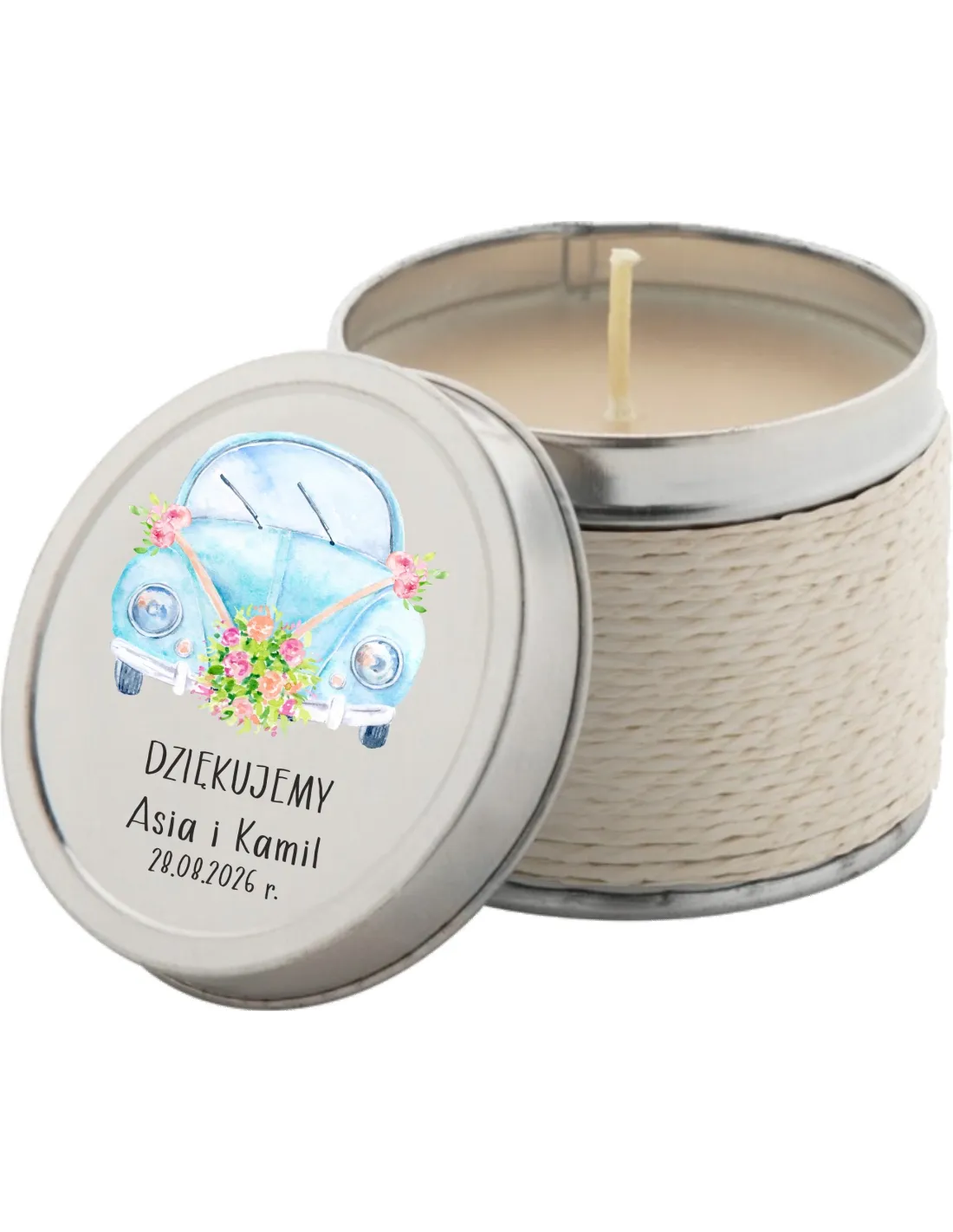 Podziękowanie dla gości weselnych na ślub świeczki zapachowe z nadrukiem UV
