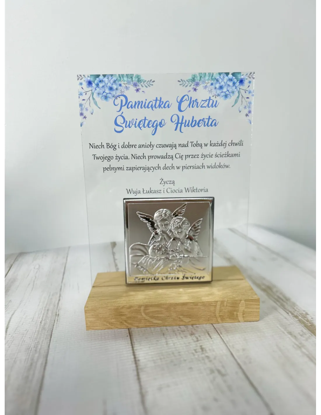 PAMIĄTKA CHRZTU ŚWIĘTEGO STATUETKA z plexi srebrnym obrazkiem TWÓJ TEKST
