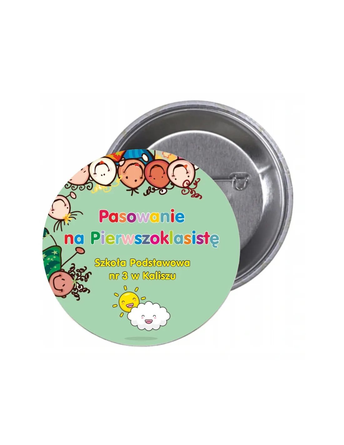 • Materiał: Metalowa przypinka z agrafką + nadruk pełnokolorowy CMYK + folijka