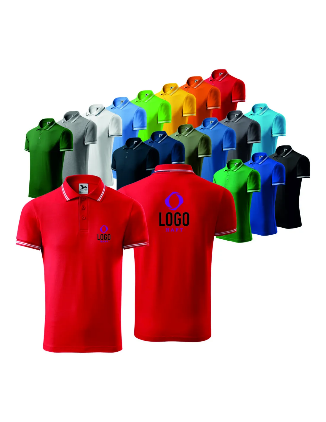 • Męska koszulka polo z kontrastowymi paskami na kołnierzyku i mankietach rękawków, 65% bawełna, 35% poliester, gramatura 200g/m²