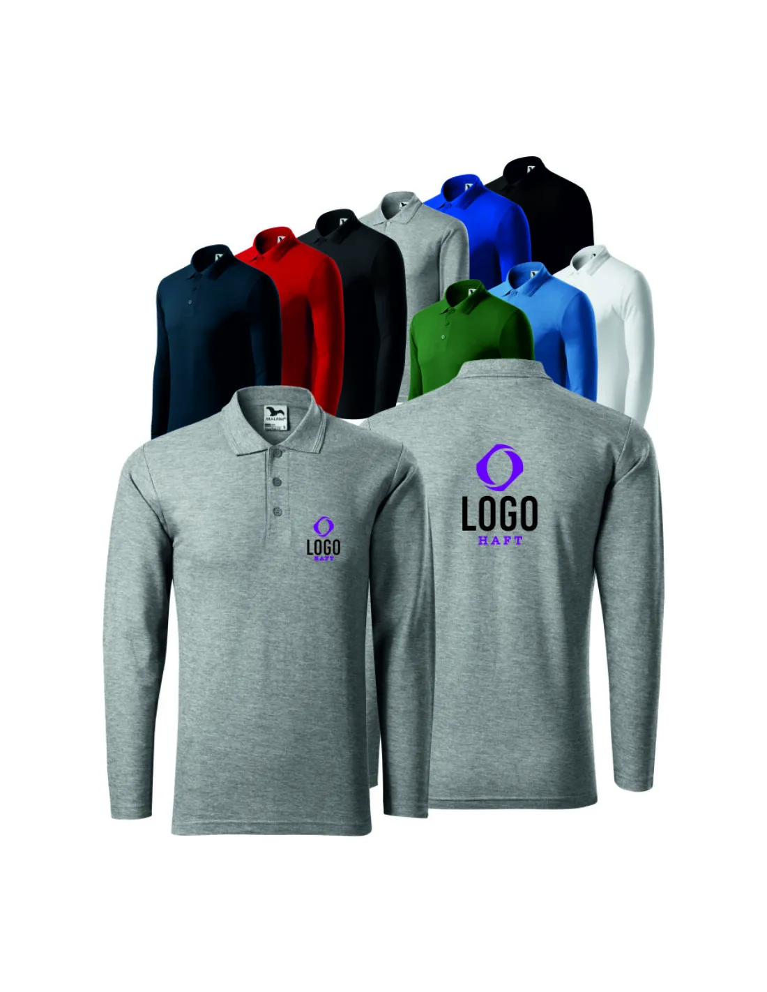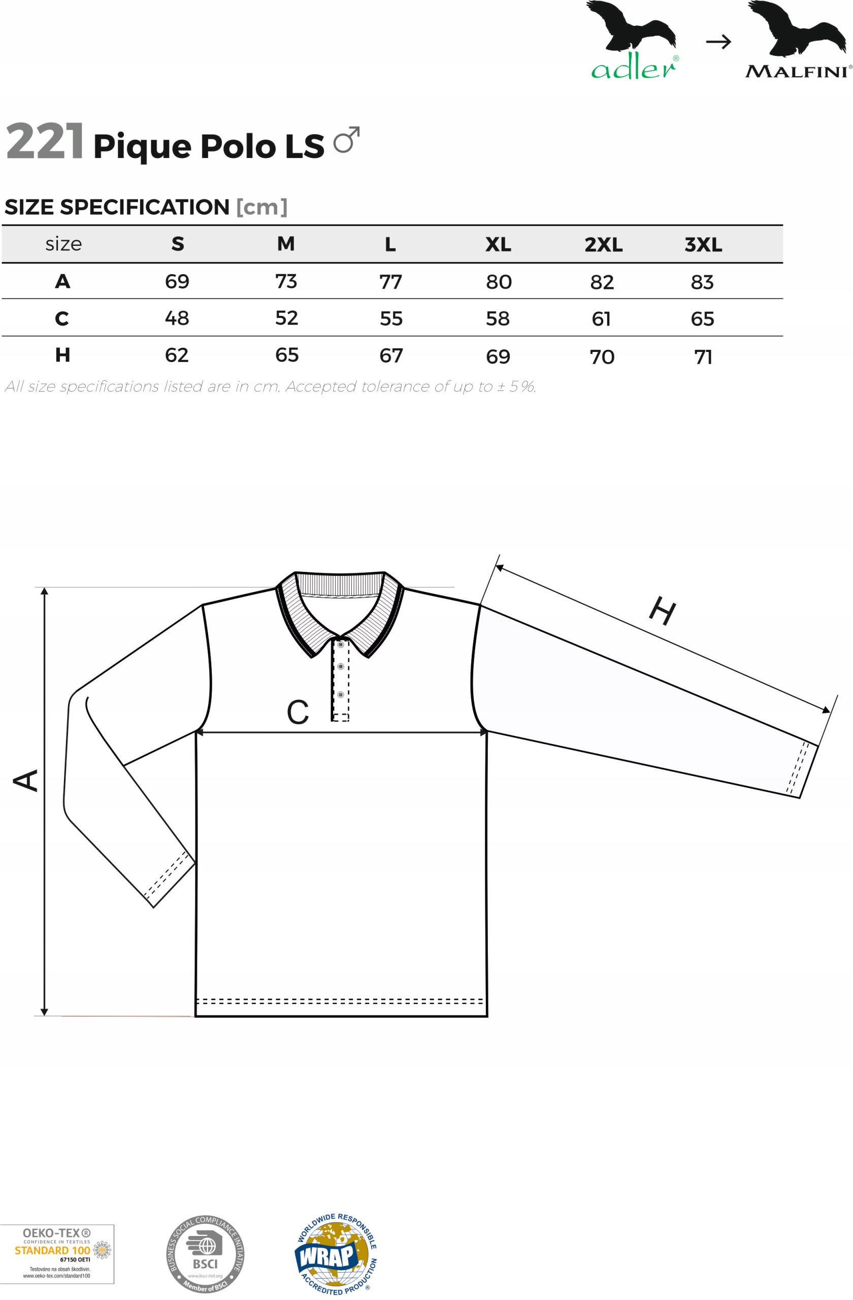 • Polo męskie z długim rękawem z materiału pique, 65% bawełna, 35% poliester, gramatura 200g/m²