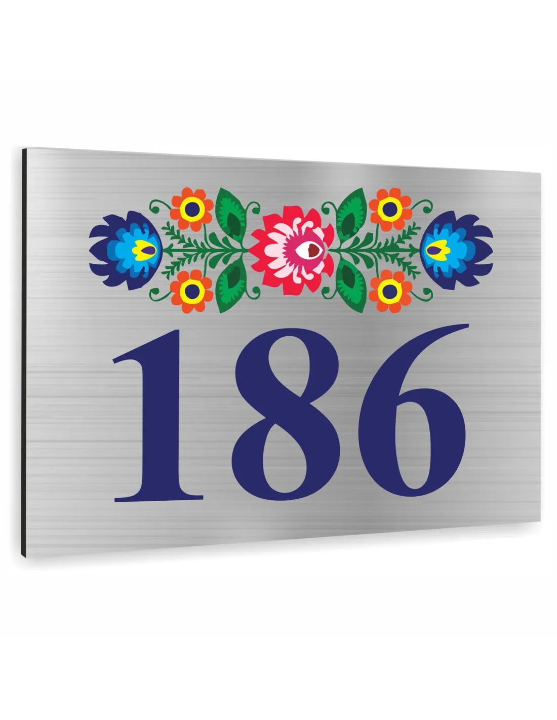 NUMER NA BUDYNEK dom Tabliczka INOX motyw ludowy kwiaty ALUMINIUM 3D 20x15 cm dibond