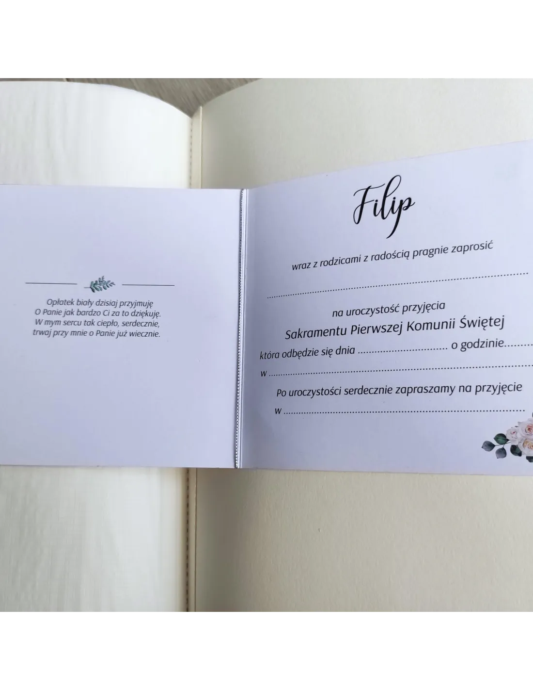 Personalizowane komunijne zaproszenie na pierwszą komunię świętą hostia kwiaty