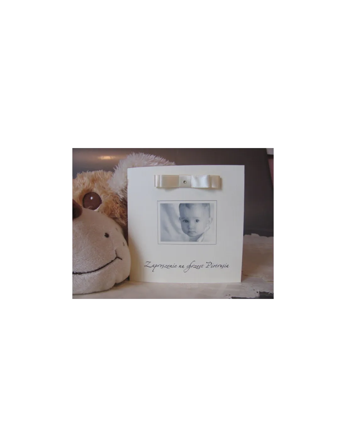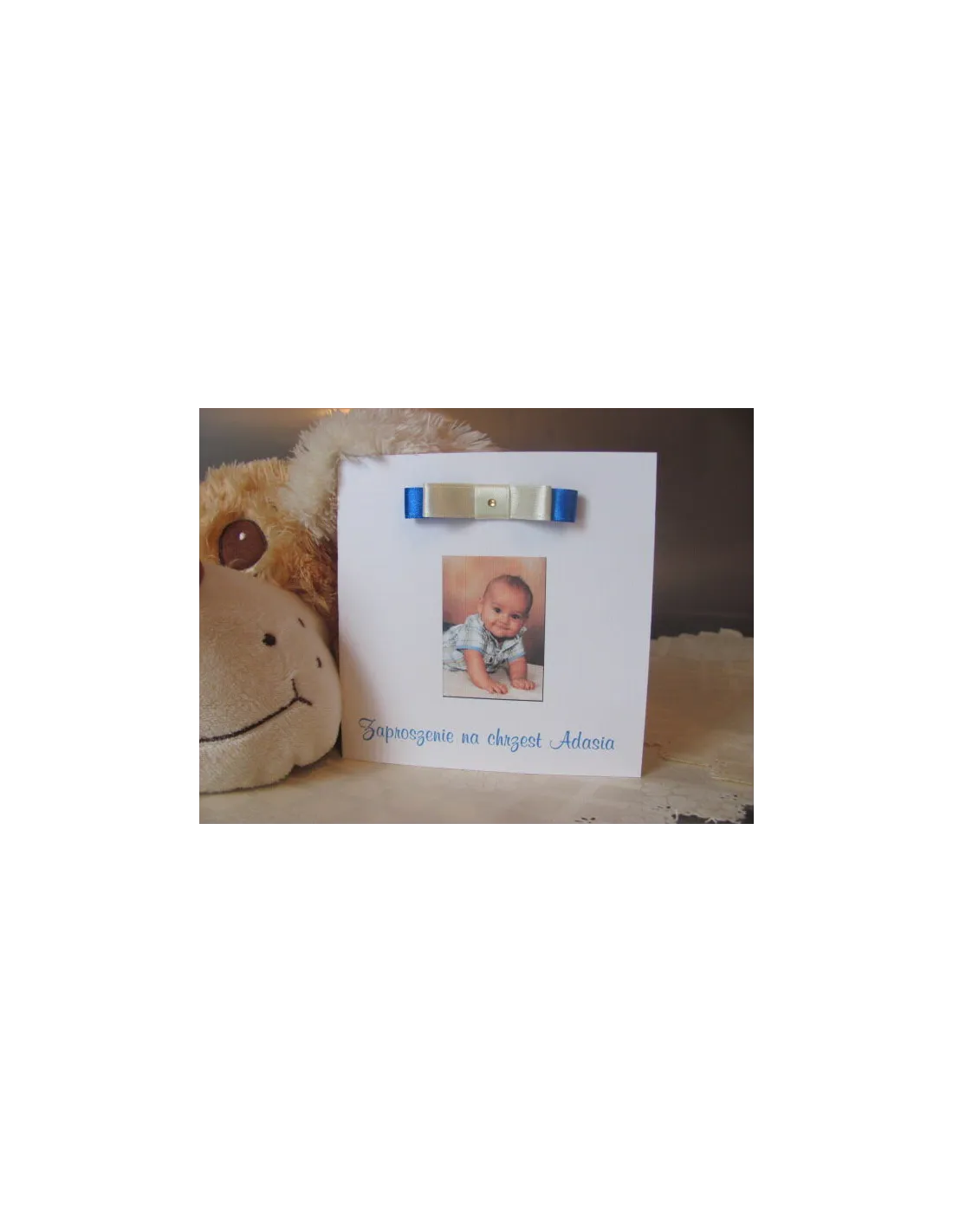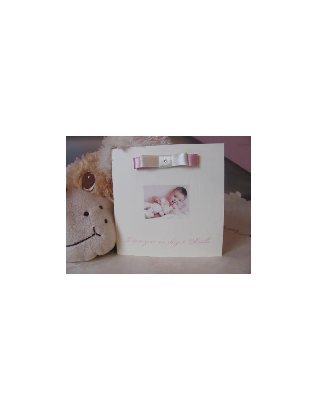 Zaproszenia kwadratowe na chrzest roczek urodziny ze wstażka i dżetem oraz zdjęciem dziecka